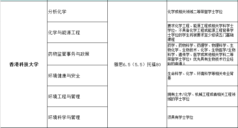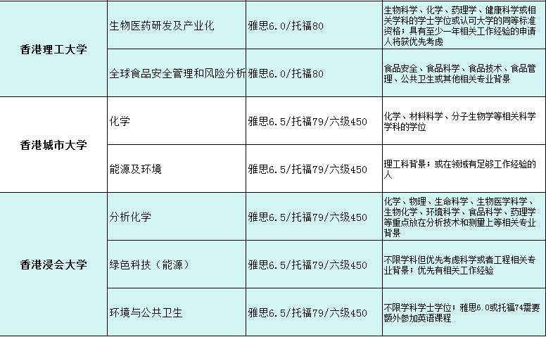 港三建议985/211均分80+,双非均分85 +。城大、理工、浸会建议985/211均分75+,双非均分80+ 跨专业申请化学相关项目会比较难,本科需要是相关专业或者是环境,食品,医药。