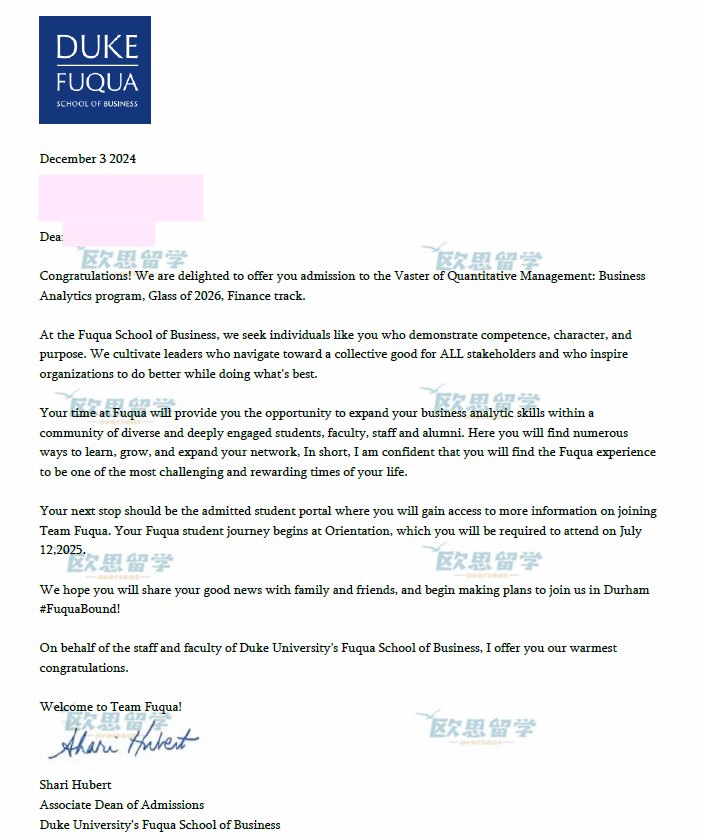 【1204录取动态】喜报!获得美国杜克大学商业分析offer