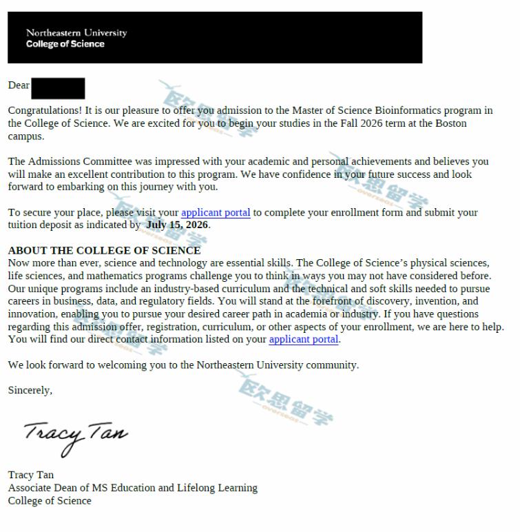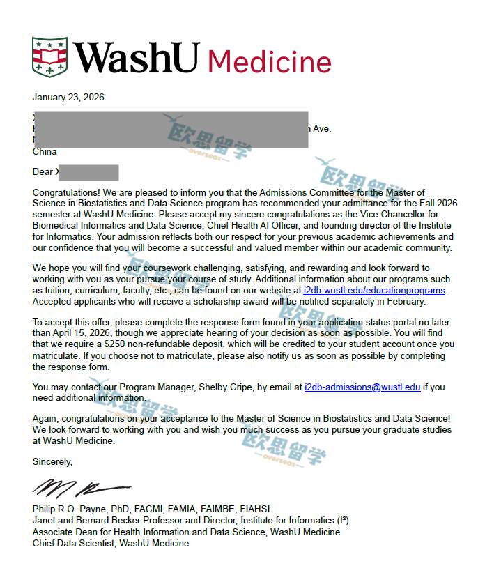 【0126录取动态】恭喜!Y童鞋同时获得美国圣路易斯华盛顿大学和东北大学生物信息学硕士offer