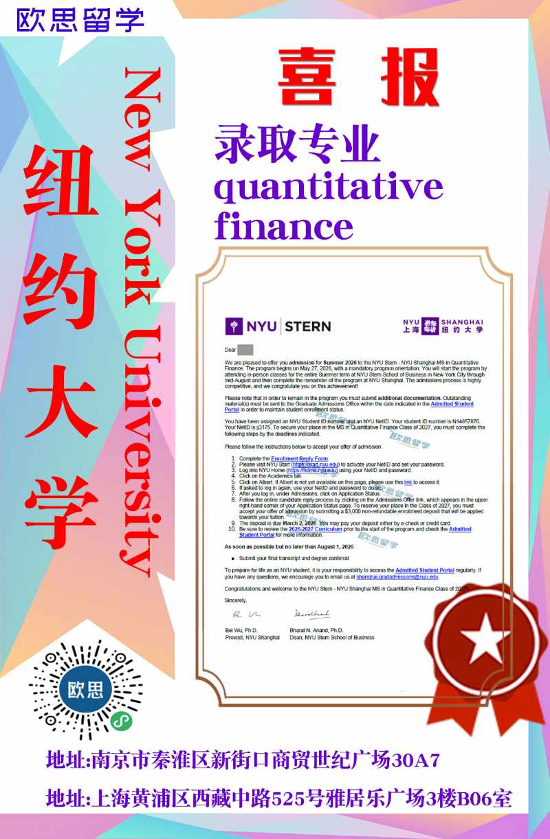 【0129录取动态】重磅! 恭喜童鞋被纽约大学Stern商学院的Quantitative Finance量化金融专业硕士录取!