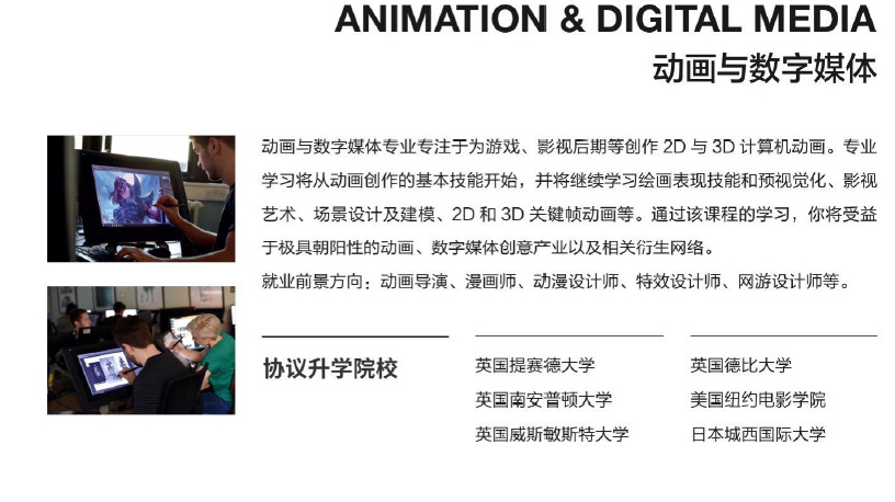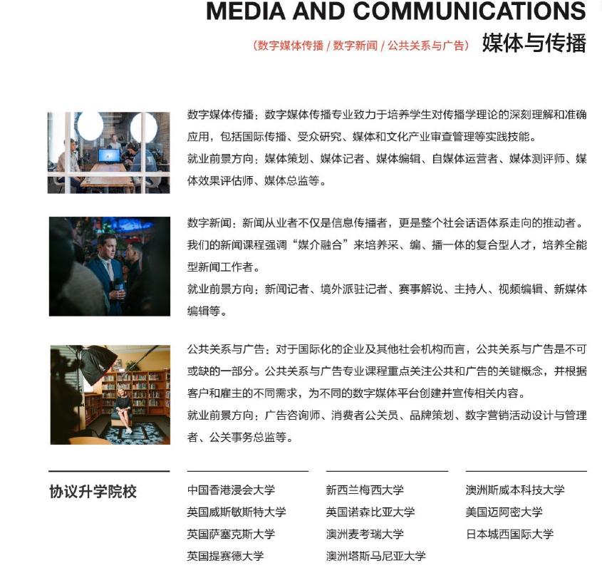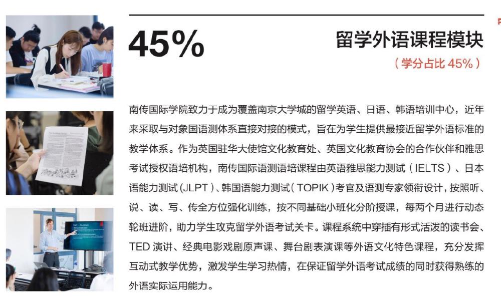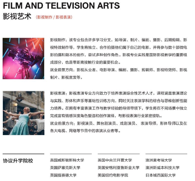 南京传媒学院国际学院是中国教育部留学服务中心签署双向协议的战略合作伙伴、 中国教音国际交流协会会员、英国文化教音协会批准认可雅思机构、新华网最受家长信赖出国服务机构,是南方地区具备出国留学教育资质、 专注传媒艺术类专业国际教育的重点艺术院校。 目前, 南京传媒学院已与美国、 加拿大、 英国、 新西兰、 澳大利亚、 意大利 、 法国、 西班牙、 芬兰、日本、 韩国及中国港涣台地区等 60 余所全球传媒艺术领域的一流大学建立了校际合作关系,合作院校均为中国教育部备案认可的海外院校。 学院办学以来, 已成功输送了 2000 余名学生赴海外院校就读本科及硕士。作为南京传媒学院直属的归口负责国际教育的教学单位, 南传国际学院面向全国招收有意向出国留学就读本科的学生, 学生全日制在南传学院完成我校与海外院校联合设立的 2 年学制的出国留学预备课程;完成预备课程后, 凭课程结业证书及留学外语成绩, 将升入与我校建立校际合作关系的海外大学续读本科后续课程,获得海外大学本科文凭。