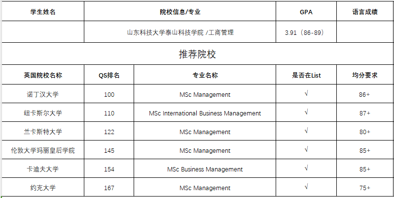 山东科技大学泰山科技学院 (双非)工商管理专业,绩点3.91,意向英硕管理专业,推荐院校及专业如下: