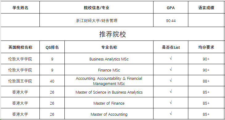 浙江财经大学(双非)财务管理专业,GPA90.44,意向港英硕士BA、会计、金融专业,推荐院校及专业如下: