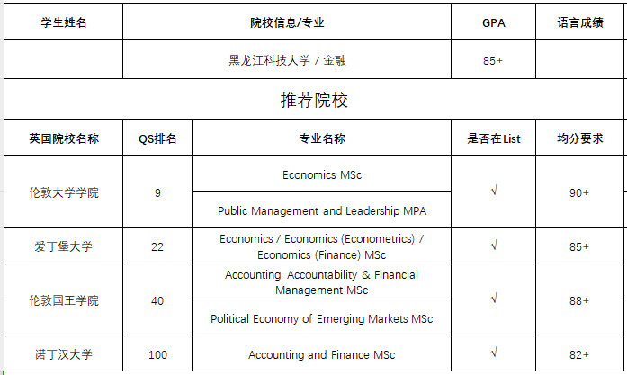 黑龙江科技大学 (双非)金融专业,GPA85,意向英硕商科经济类,推荐院校及专业如下: