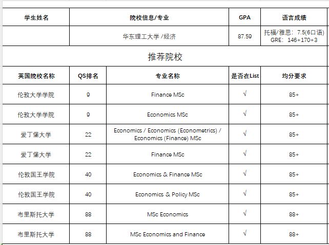 华东理工大学(211)经济学专业,GPA87.59,意向英硕金融、经济类专业,推荐院校及专业如下: