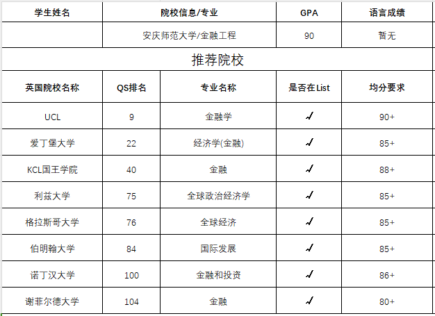 安庆师范大学(双非)金融工程专业,GPA90,意向英硕金融,经济专业,推荐院校及专业如下: