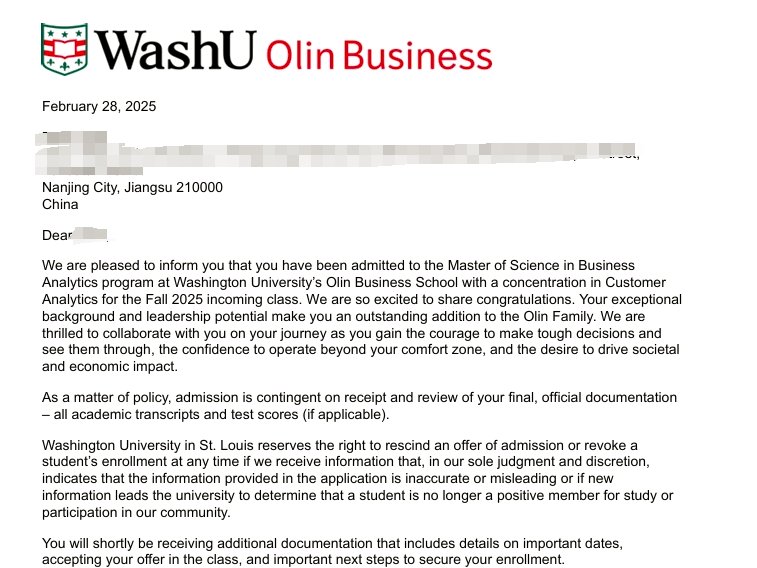圣路易斯华盛顿大学(Washington University in St. Louis),简称WashU或者WUSTL。创立于1853年,是美国历史上建校最早,也是最负盛名的“华盛顿大学”,属世界一流大学。位于美国密苏里州圣路易斯市,美国9所“新常春藤”名校之一,属世界一流大学。校园周围环绕着宁静的森林公园,为学生提供了宜人的学习和生活环境。这里充满活力,同时又拥有丰富的文化和社交活动,为每一位学生提供了广泛的机会去探索。 WUSTL的BA项目由CSE和Marketing两个系合办,它的前身是Customer Analytics 硕士项目。该项目已成功融合了传统的市场营销研究和创新的数据分析技术,课程设置扎实,为学生提供了丰富的实践学习机会。此外,该项目还与 IBM 进行了合作,进一步拓展了学生的学习与实践领域。 圣路易斯华盛顿大学的商业分析硕士项目是一项STEM认证的学位项目,尤其适合那些希望通过数据分析解决复杂商业问题的学生。该项目的入学时间通常为每年的秋季(即8月),学制为3个学期,约18个月完成。项目接受GMAT和GRE成绩, WUSTL的商业分析硕士项目设有六个细分方向(Track),分别为: 1. 顾客分析(Customer Analytics)2.金融科技分析(Financial Technology Analytics)3. 供应链分析(Supply Chain Analytics)4. 会计分析(Accounting Analytics)5. 医疗分析(Healthcare Analytics)6. 人才分析(Talent Analytics) 项目的课程设计十分灵活,学生可以根据个人兴趣和职业规划选择一个Track方向。 该专业要求申请人本科学位,GPA建议3.0+,学生需具备一定的数学基础,入学前需修读过微积分I和II以及统计学课程。GRE/GMAT不是必须的,但是建议提交,增加竞争力,语言没有最低要求,建议雅思7.0+,托福100+ 我们今天录取的童鞋是英国南安普顿大学本科,统计学专业,GPA wes 认证2.98,有一段暑期科研和两段寒暑假实习,无语言无G提交申请,顺利拿到美国名校圣路易斯华盛顿大学的商业分析硕士项目MS in Business Analytics的录取。