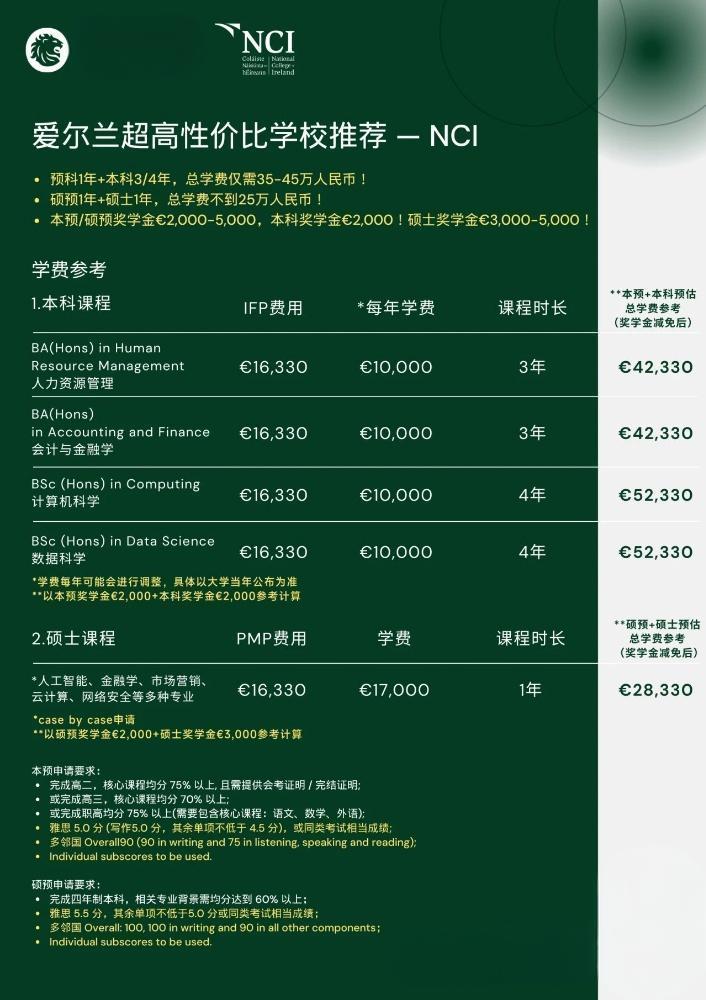 【0814留学资讯】留学+移民一步到位!爱尔兰National College of Ireland(NCI)本科硕士申请攻略
