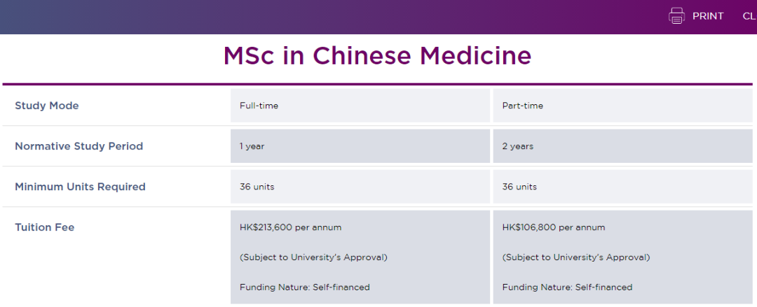 一个冷门专业,全日制只需要读一年,学费比较便宜,不到22万HKD。有两个分支方向,一个中医学(有全日制和兼读制两种模式),另一个是针灸学(只有兼读制模式)。这个项目是面向中医相关专业背景的学生的,受众比较窄。同时,要和同学院下的另一个长相非常相似的项目——Master of Chinese Medicine 区分开来,Master of Chinese Medicine不要求中医相关专业背景,但要读4年。另外,其实港中文去年也新增了一个中医方面的硕士专业,名称叫MSc in Chinese Medicine Pharmacology and Drug Development,去年第一年招生其实并不理想,所以这个MSc in Chinese Medicine只要专业背景符合,绩点达到最低要求,难度估计就不会太大。