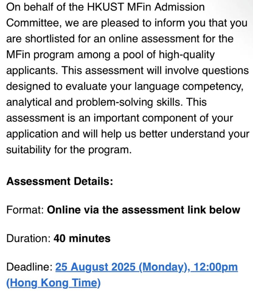 也就是说申请26Fall申请港科大金融硕士的同学,必须在常规面试前先通过一轮40分钟的线上闭卷考核,包括书面问答、视频答题、全程录像录屏监控。