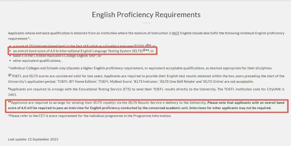 香港城市大学26fall研究生项目官网最近刚更新 雅思最低要求从6.5降到6.0啦!持雅思6.0的申请人需要通过面试考察一下英语能力~ (各个项目的官网还没有更新这条,等过几天网申开放可以进各个项目官网确认最新雅思要求;特别看重语言能力的项目,比如语言/传媒/法学/热门社科,那还是最好高于最低要求分数的!)