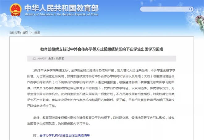 近年来,由于海外疫情影响出入境受到限制,不少拿到海外院校Offer的同学面临出国求学困境,从2021年开始,教育部临时允许部分合作办学机构和项目增加招生名额,为打算出国留学但出入境受到的限制的留学生提供就读机会。