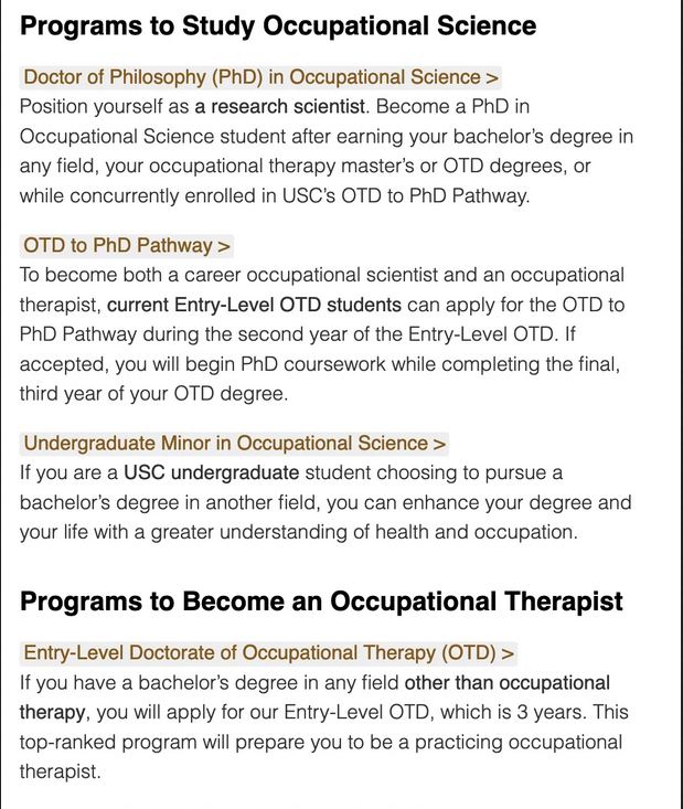 不同于大多数院校只有entry-level和post-professional两个项目,南加州大学针对不同背景的学生开设了多个Occupational Therapy的项目。比如,本科专业为非康复治疗相关专业的学生,可以选择三年期的entry-level Occupational Therapy Doctorate (OTD) 项目; 本科专业为康复治疗专业的学生,除了传统的的post-professional MA项目外,也可以选择提供教育、行政政策、临床研究等分支的post-professional OTD. 另外,如果想走研究型路线的话,学校也开设了相应的PhD项目。由此可见,南加州大学在项目设置上最大程度地满足了多元的职业目标与追求。