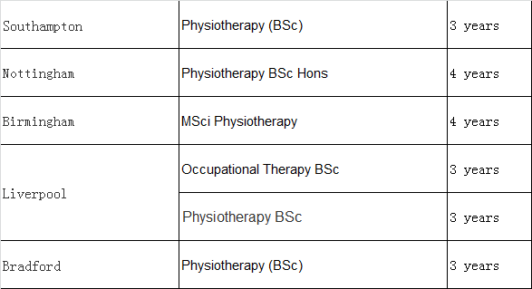 此外,诺丁汉大学(University of Nottingham),利物浦大学(Univesity of Liverpool)以及布拉福德大学(University of Bradford)也都提供3年制的本科课程,并且都在英国院校理疗专业排名前10。